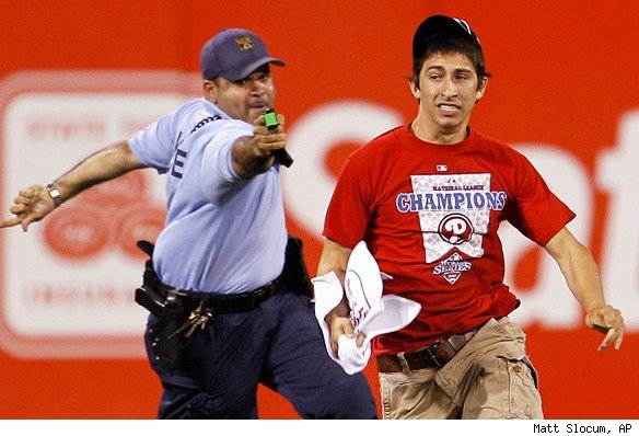 The National League was getting the hint. It was falling behind in the battle for the Sports Fan mind share. The League has been in freefall years after being stymied by an anti-drug culture and a noisy congressional backlash to its once ballyhooed steroid era. Many had suspected that the NL would change things up, perhaps even adopting the Designated Hitter like its American League rival. Instead, the NL Rule Change Committee shocked the sports world yesterday when it announced that it would arm middle infielders with Tasers to help mitigate security concerns of idiot fans running the bases between innings, but as an added bonus, they could also use the devices to debilitate base runners trying to get from first to third on sharp liners to the outfield.